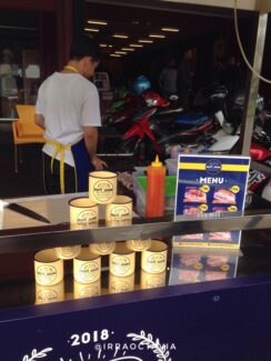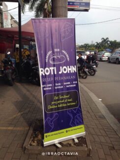 Sebenarnya ada apa dengan warna ungu ya? Beberapa merk Roti John lain yang pernah dilihat menggunakan warna ungu sebagai warna dasar logonya, padahal mereka beda lho. Hmm…