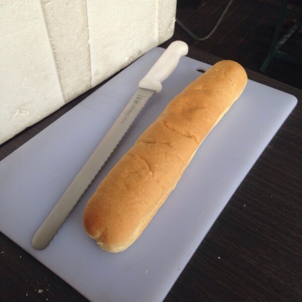 Ukuran rotinya cukup besar. Sepanjang talenan. Jadi inget roti Baguette yang panjang khas Perancis itu. Cuma bedanya, roti Baguette keras dan roti John ini lembut banget.