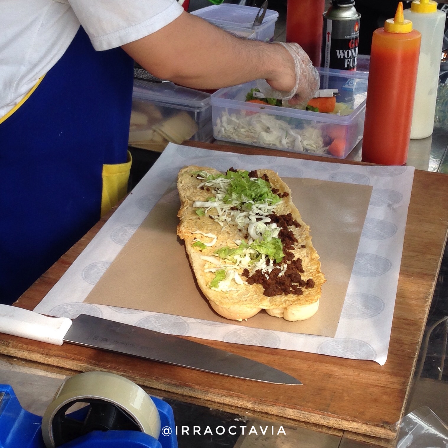 Awalnya aku kira roti ini bakalan dibakar, jadi kayak roti bakar gitu. Ternyata rotinya hanya dilapisi telur yang dipanaskan diatas ketel. Jadi telurnya langsung meresap ke rotinya. Kemudian langsung ditaburi daging olahan yang katanya resep peranakan itu dan sayuran, ditutup dengan saus sambal, tomat dan mayonais. Sudah. Langsung dipotong jadi 8 bagian. Lumayan banyak juga ya!